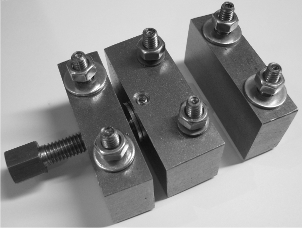 The design The all steel vise (e.g. Sherline's vises are cut from aluminum) is a so-called plane mill vise. It consists of three brackets. Two are stationary and directly screwed on the mill table using e.g. steel T-bolts. One acts as a jaw the other holds the lead screw. The third bracket (or jaw) moves along the mill table by means of a steel lead screw. Also that bracket is squared by T-bolts. The work piece is clamped between the jaws by means of the lead screw. In addition, the moveable jaw can be fixed on the mill table, if required, to prevent lifting up the vice jaw in heavy milling operations. (Note, however, if you bolt something from two different directions you may loose up the bolts on the other side. Therefore, fix the top bolts just a little more than hand tight that the jaw will not lift up. The work piece is clamped using the lead screw.) The stationary brackets can be set at different positions on the mill table which makes the size of this vise adjustable. The lead screw has a steel hex bar handle which allows one to use a wrench key. The jaws are hard and flat.