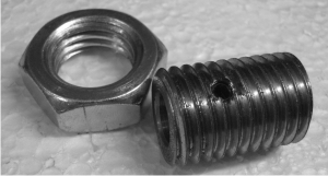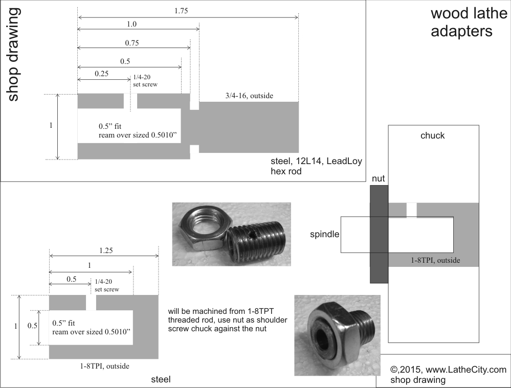These adapters slide over a pin type spindle (usually a wood lathe or grinder) and are hold with a setscrew. There are too many sizes out there, i.e., these are made to order. Shown here are two examples (see drawing). The nut acts are a shoulder for the wood chuck.